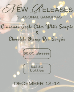 We have two new seasonal sangrias available to purchase! Both sangrias will be part of our Sweet Ride Flight. You can also try them in a Build Your Own Flight. Throughout the weekend we’ll have special pricing on both glass & bottle sales. Our seasonal sangrias for this year are: