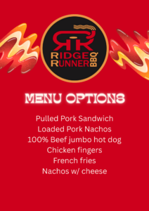Enjoy food from Ridge Runner BBQ. A menu will be posted closer to the date. Please note we do not allow outside food when we have a food vendor onsite.